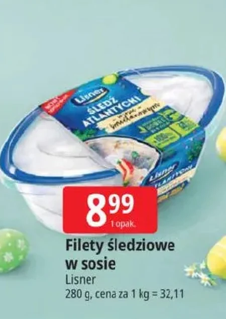 Filety śledziowe w sosie Lisner w E.Leclerc kosztują 8,99 zł za opakowanie o wadze 280 g, co daje cenę 32,11 zł za kilogram. Aktualnie w E.Leclerc obowiązuje promocja na ten produkt, dzięki której można go nabyć w obniżonej cenie. Śledzie w sosie Lisner idealnie sprawdzą się jako szybka i smaczna przekąska lub składnik sałatki. Dostępne w jednym opakowaniu.