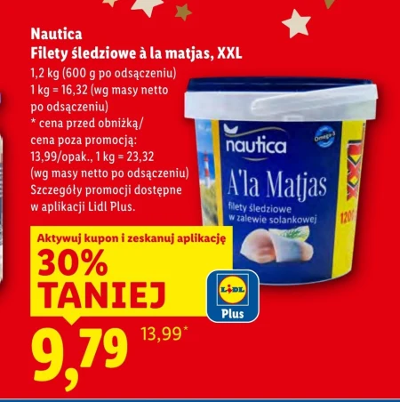 Nautica Filety śledziowe à la matjas, XXL 1,2 kg (600 g po odsączeniu) 1 kg = 16,32 (wg masy netto po odsączeniu) * cena przed obniżką/ cena poza promocją: 13,99/opak., 1 kg = 23,32 (wg masy netto po odsączeniu) Szczegóły promocji dostępne w aplikacji Lidl Plus.