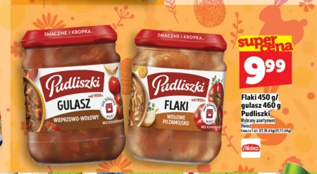 Flaki Pudliszki 450 g w promocji Topaz kosztują 9,99 zł (22,20 zł/kg), a gulasz Heinz 460 g – 9,99 zł (21,72 zł/kg). To okazja na gotowe dania obiadowe w korzystnej cenie, idealne do szybkiego podgrzania i podania na talerz. Oba produkty sprawdzą się jako pożywne posiłki bez konieczności długiego gotowania. Nie przegap tej zniżki – warto uzupełnić zapasy, zanim promocja się skończy.