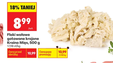 Flaki wołowe, gotowane i krojone, Kraina Mięs, dostępne są w ofercie Biedronka w cenie 8,99 zł za sztukę, co stanowi 18% zniżki względem ceny 10,99 zł, waga produktu to 500 g, a cena za kilogram to 17,98 zł. Ten produkt to gotowy składnik tradycyjnych polskich dań, idealny do przygotowania aromatycznej zupy lub gulaszu. Dzięki wcześnemu ugotowaniu i pokrojeniu, oszczędzasz czas w kuchni i możesz skupić się na dopełnieniu smaku ulubionymi przyprawami. Warto skorzystać z tej okazji, by zaoszczędzić i cieszyć się smakiem domowej kuchni bez zbędnego wysiłku.