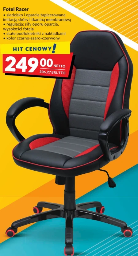 Fotel Racer • siedzisko i oparcie tapicerowane imitacja skóry i tkaniną membranową • regulacja : siły oporu oparcia, wysokości fotela • state podłokietniki z nakładkami kolor czarno-szaro-czerwony. Cena netto - 249 zł.
