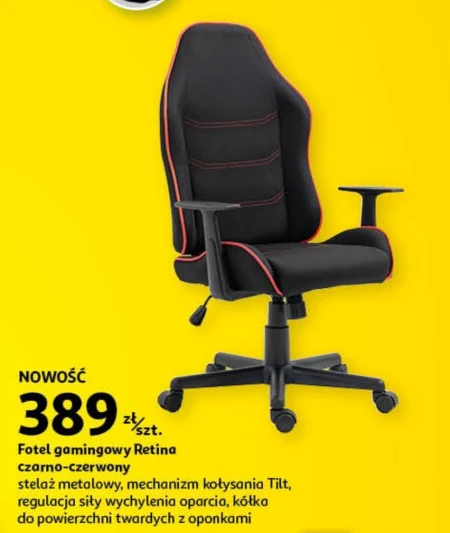 Fotel gamingowy Retina zł/ czarno-czerwony stelaż metalowy, mechanizm kołysania Tilt, regulacja siły wychylenia oparcia, kółka do powierzchni twardych z oponkami.