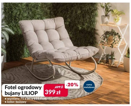 Fotel ogrodowy bujany LILIOP jest dostępny w ofercie Agata w cenie 399 zł, po obniżce z 499 zł. To wygodne rozwiązanie do relaksu na świeżym powietrzu, idealne do ogrodu, na taras czy balkon. Fotel ma wymiary 75 x 81 x 115,5 cm i utrzymany jest w kolorze beżowym, a jego rama wykonana jest z metalu. To świetna okazja, by stworzyć przytulną przestrzeń do odpoczynku na ciepłe dni. Oferta ważna od 2026-04-09 do 2026-04-26 Źródło: gazetka Agata