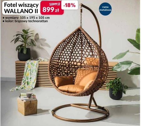 Fotel wiszący WALLANO II • wymiary: 105 x 195 x 105 cm • kolor: brązowy technorattan 1099 zł przekreślona 899 zł -18% Fotel wiszący WALLANO II dostępny jest w ofercie Agata w cenie 899 zł, po obniżce z 1099 zł, co stanowi aż 18% zniżki. Ten wygodny fotel o wymiarach 105 x 195 x 105 cm został wykonany z brązowego technorattanu, co zapewnia mu trwałość i estetyczny wygląd. Idealnie sprawdzi się w ogrodzie, na balkonie, czy tarasie, tworząc relaksującą strefę wypoczynku. Fotel wiszący WALLANO II to doskonały sposób na chwilę wytchnienia na świeżym powietrzu, oferując komfortowe bujanie i swobodę ruchów. Jego solidna konstrukcja gwarantuje bezpieczeństwo użytkowania, a materiał jest odporny na warunki atmosferyczne. To wyjątkowa okazja, by stworzyć przytulny kącik w swoim ogrodzie bez nadmiernych kosztów. Warto wykorzystać obniżkę i cieszyć się komfortem oraz relaksem przez długie godziny. Oferta ważna od 2026-04-09 do 2026-04-26 Źródło: gazetka Agata