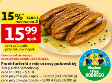 Frankfurterki z mięsa rasy puławskiej 320 g, Dział Samoobsługi cena za 100 g - 5,31 zł cena przy zakupie 2 opak. - 31,98 zł (5,00 zł/100 g) cena przy zakupie 1 opak. - 18,99 zł (5,93 zł/100 g)