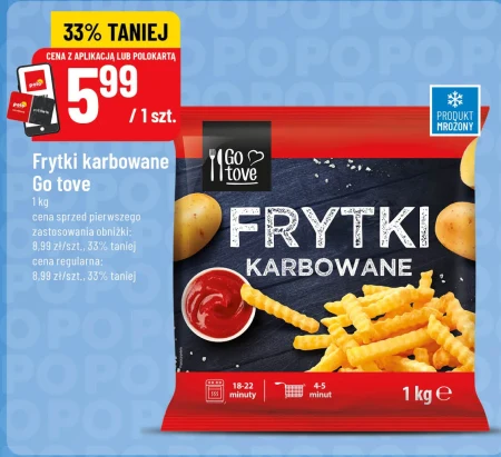 Frytki karbowane Go tove, o wadze 1 kg, dostępne są w ofercie POLOmarket w cenie 5,99 zł, dzięki obniżce wynoszącej 33% z aplikacją lub POLOKARTĄ. Zostały stworzone po to, aby szybko i łatwo przygotować pyszną przekąskę – gotowe w zaledwie 18-22 minuty z piekarnika lub 4-5 minut na głębokim tłuszczu. Produkt jest mrożony i idealnie sprawdzi się jako dodatek do dań lub samodzielna, chrupiąca potrawa. Skorzystaj z okazji i przygotuj smaczne frytki w wyjątkowej cenie. Oferta ważna od 2026-04-15 do 2026-04-21 Źródło: gazetka POLOmarket