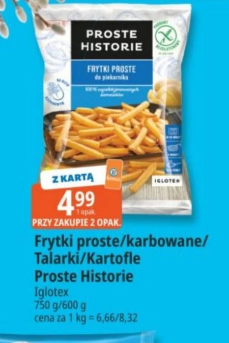 Frytki Proste Historie, dostępne w opakowaniach o wadze 750g lub 600g, w E.Leclerc można nabyć już za 4,99 zł za opakowanie, co daje cenę 6,66 zł lub 8,32 zł za kilogram. Te klasyczne, proste lub karbowane frytki to idealny dodatek do dań mięsnych, przekąska podczas spotkań z przyjaciółmi lub szybki obiad dla całej rodziny. Proste Historie oferują sprawdzony smak i wygodę przygotowania, a ich uniwersalność sprawia, że sprawdzą się w każdym domu – warto skorzystać z oferty przy zakupie dwóch opakowań i przygotować zapas na dłużej.