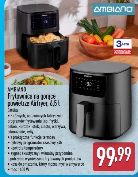 AMBIANO Frytownica na gorące powietrze Airfryer, 6,5 l Sztuka · 8 różnych, ustawionych fabrycznie programów frytowania (np. frytki, bekon, kurczak, stek, ciasto, warzywa, odmrażanie, ryby) · z praktyczną funkcją termosu · cyfrowy programator czasowy 24h · kontrola temperatury · sygnał akustyczny i wizualny przypomina o potrzebie wymieszania frytowanych produktów · kosz do smażenia, który można myć w żmywarce · moc 1400 W