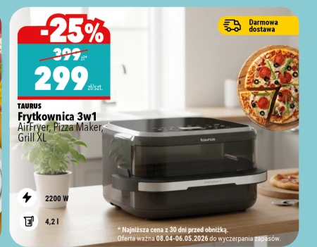 Frytkownica 3w1 Taurus dostępna jest w ofercie Biedronka w cenie 299 zł, obniżonej o 25% z 399 zł. Urządzenie łączy funkcje frytkownicy, urządzenia do przygotowywania pizzy oraz grilla XL, a jego pojemność to 4,2 litra. Dzięki mocy 2200 W umożliwia szybkie i efektywne przygotowanie ulubionych potraw. Oferta ważna od 8 kwietnia do 6 maja 2026 roku do wyczerpania zapasów, z darmową dostawą. To doskonała okazja, aby poszerzyć możliwości kuchenne o wszechstronne urządzenie. Oferta ważna od 2026-04-08 do 2026-05-06 Źródło: gazetka Biedronka