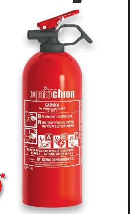 Gaśnica samochodowa proszkowa ABC, waga 1 kg.