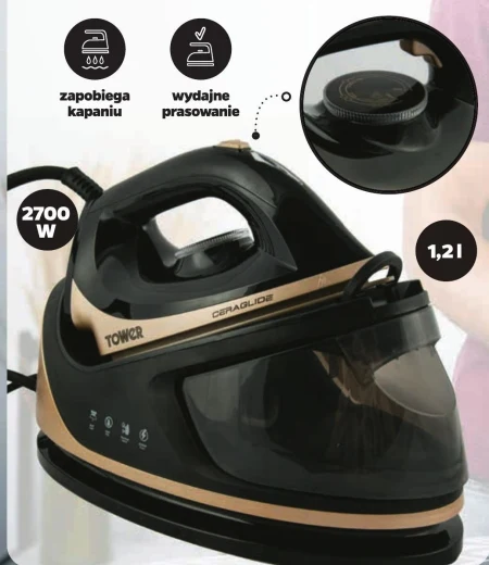 Żelazko z generatorem pary 2700 W > długi, nieplączący sią przewód zasilający o długości 1,7 m > funkcja pary ciągłej 80 g/min > możliwość prasowania parowego lub na sucho > filtr zapobiegający osadzaniu sią kamienia