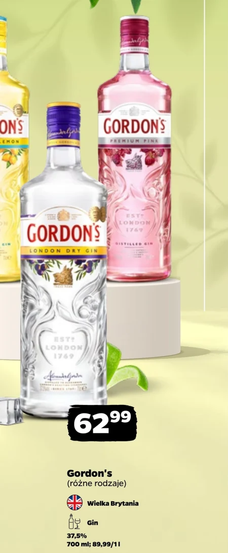 Gordon's (różne rodzaje) wódka brytyńska gin 37,5% 700 ml: 69,99/1l Klasyczna brytyjska wódka lub gin Gordon's, idealna do przygotowania ulubionych koktajli lub delektowania się w czystej postaci. Pojemność 700 ml w cenie 69,99 zł za litr sprawia, że to propozycja dostępna w sklepach Netto. Doskonały wybór na spotkania towarzyskie lub wieczorny relaks. Aktualna promocja pozwala zaoszczędzić, warto sprawdzić w najbliższej gazetce Netto.