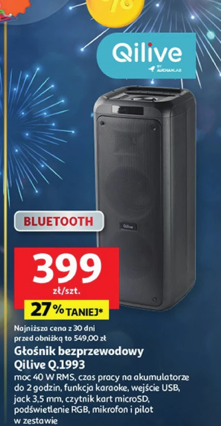 Głośnik bezprzewodowy Qilive Q.1993 moc 40 W RMS, czas pracy na akumulatorze do 2 godzin, funkcja karaoke, wejście USB, jack 3,5 mm, czytnik kart microSD, podświetlenie RGB, mikrofon i pilot w zestawie