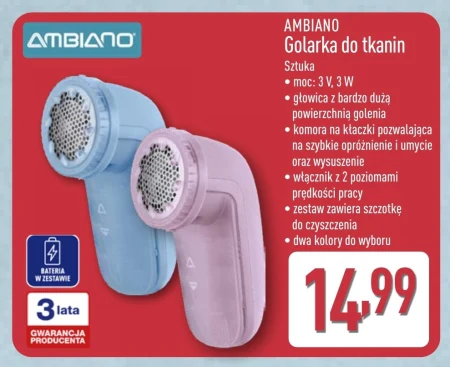 Golarka do tkanin Ambiano jest dostępna w promocji w sieci Aldi za 14,99 zł. To praktyczne urządzenie zasilane bateriami, które skutecznie usuwa kłaczki, pilling i zmechacenia z ubrań, swetrów czy pościeli. Duża głowica zapewnia szybkie golenie nawet na większych powierzchniach, a komora na zanieczyszczenia ułatwia utrzymanie czystości. W zestawie znajduje się szczotka do czyszczenia, a dwa poziomy prędkości pozwalają dostosować pracę do rodzaju tkaniny. Dostępna w dwóch kolorach, to wygodne rozwiązanie dla tych, którzy chcą odświeżyć garderobę bez wysiłku. Warto skorzystać z okazji, zanim promocja się zakończy. Oferta ważna od 2026-04-22 do 2026-04-25 Źródło: gazetka Aldi