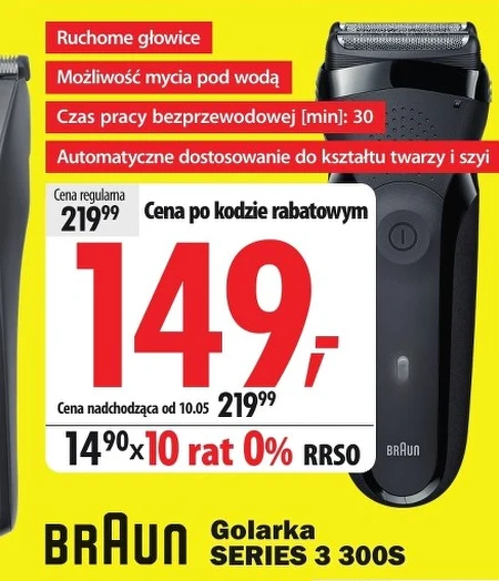 Braun Golarka SERIES 3 300S jest dostępna w ofercie Media Expert w cenie 149,99 zł po zastosowaniu kodu rabatowego, zamiast ceny regularnej 219,99 zł. Golarka posiada ruchome głowice, dzięki czemu idealnie dopasowuje się do kształtu twarzy i szyi, a także może być myta pod bieżącą wodą, co ułatwia jej czyszczenie. Urządzenie zapewnia 30 minut pracy bezprzewodowej, co pozwala na komfortowe i szybkie golenie. Możliwość zakupu na 10 rat 0% RRSO sprawia, że jest to wyjątkowa okazja, ponieważ cena powróci do 219,99 zł już 10 maja. Źródło: gazetka Media Expert