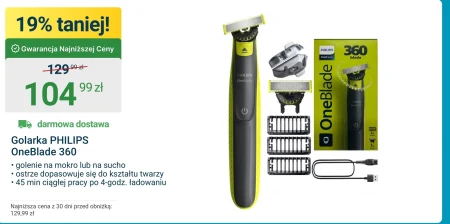 Golarka PHILIPS OneBlade 360 · golenie na mokro lub na sucho · ostrze dopasowuje się do kształtu twarzy · 45 min ciągłej pracy po 4-godz. ładowaniu Najniższa cena z 30 dni przed obniżką: 129,99 zł