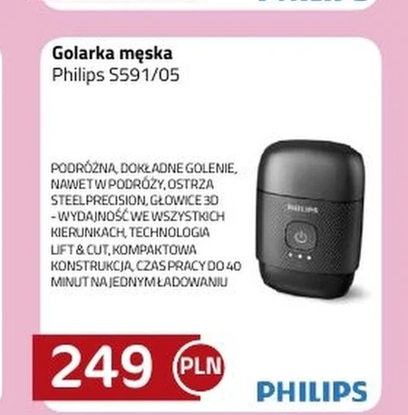 Golarka męska Philips S591/05 PODRÓŻNA, DOKŁADNE GOLEIE, NAWET W PODRÓŻY, OSTRZA STEEL PRECISION, GŁOWICE 30 - WYDAJNOŚĆ WE WSZYSTKICH KIERUNKACH, TECHNOLOGIA LIFT & CUT, KOMPAKTOWA KONSTRUKCJA, CZAS PRACY DO 40 MINUT NA JEDNYM ŁADOWANIU