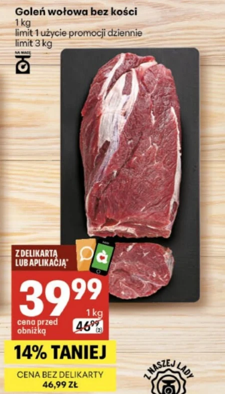 Goleń wołowa bez kości jest dostępna w ofercie Delikatesy Centrum w cenie 39,99 zł za 1 kg, co stanowi 14% oszczędności względem ceny 46,99 zł. Ten wysokiej jakości kawałek wołowiny idealnie nadaje się do przygotowania różnorodnych dań, od gulaszu i zup, po duszone mięso i pieczenie. Produkt jest dostępny z Delikartą lub poprzez aplikację, z limitem jednej promocji dziennie. Warto skorzystać z tej okazji, by zaopatrzyć się w doskonały składnik do swoich ulubionych potraw. Oferta ważna od 2026-04-16 do 2026-04-22 Źródło: gazetka Delikatesy Centrum