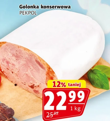 Golonka konserwowa PEKPOL jest dostępna w ofercie Prim Market w cenie 22,99 za kilogram, wcześniej 25,99, co oznacza 12% zniżkę. To gotowe do spożycia danie, idealne jako przekąska lub składnik szybkiego posiłku. Produkt charakteryzuje się wyrazistym smakiem i mięsnością, co czyni go dobrym wyborem dla miłośników tradycyjnych wędlin. Warto skorzystać z tej okazji, aby zaopatrzyć się w smaczną i wygodną golonkę. Oferta ważna od 2026-04-09 do 2026-04-15 Źródło: gazetka Prim Market