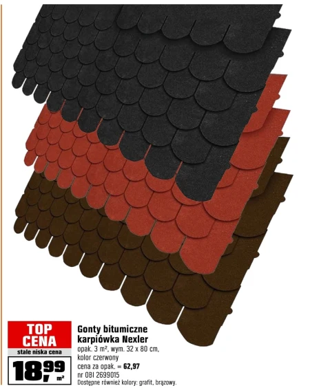 Gonty bitumiczne karpiówka Nexler opak. 3 m2, wym. 32 x 80 cm, kolor czerwony cena za opak. = 62,97 nr OBI 2699015 Dostępne również kolory: grafit, brązowy.