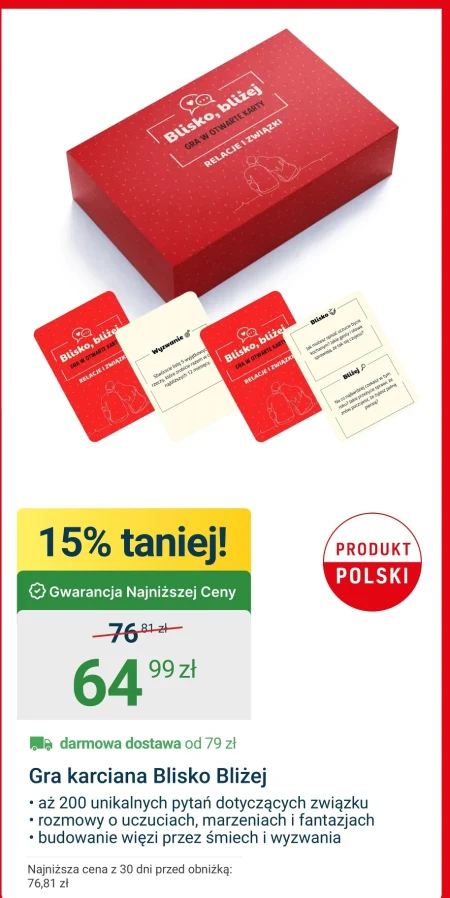 Gra karciana Blisko Bliżej · aż 200 unikalnych pytań dotyczących związku · rozmowy o uczuciach, marzeniach i fantazjach · budowanie więzi przez śmiech i wyzwania Najniższa cena z 30 dni przed obniżką: 76,81 zł