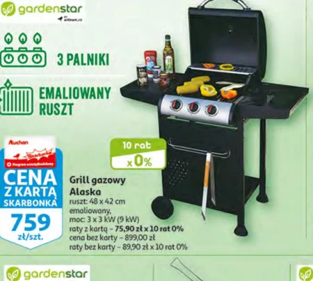 Grill gazowy Alaska ruszt: 48 x 42 cm emaliowany, moc: 3 x 3 kW (9 kW) raty z kartą -75,90 zł x 10 rat 0% cena bez karty - 899,00 zł raty bez karty-89,90 zł x 10 rat 0%