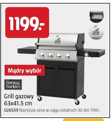 Grill gazowy Burns & Barkles o wymiarach 63x41.5 cm to propozycja dla tych, którzy szukają funkcjonalnego sprzętu do grillowania. Aktualna promocja w Jula obniża jego cenę do 1199,-, co czyni go najtańszym w ciągu ostatnich 30 dni. Sprawdzi się podczas spotkań z rodziną i przyjaciółmi, umożliwiając przygotowanie ulubionych potraw na świeżym powietrzu. Numer katalogowy produktu to 026559.