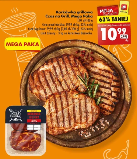 Karkówka grillowa Czas na Grill, Mega Paka 1,10 zł/100 g Cena przed obniżką: 29,99 zł/kg, 63% mniej Cena regularna: 29,99 zł/kg (3,00 zł/100 g), 63% taniej Limit dzienny - 3 kg na kartę Moja Biedronka.