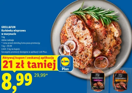 GRILL&FUN Karkówka wieprzowa w marynacie 1 kg różne rodzaje * cena przed obniżką/cena poza promocją: 1 kg = 29,99 Limit: 3 kg na kupon. Szczegóły promocji dostępne w aplikacji Lidl Plus.