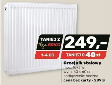 Grzejnik stalowy moc: 1073 W wym. 60 x 60 cm podłączenie: boczne cena bez karty - 289 zł
