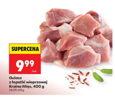 Gulasz z łopatki wieprzowej Kraina Mięs jest aktualnie dostępny w ofercie Biedronka w cenie 9,99 zł za opakowanie 400 g, co daje 24,98 zł za kilogram. To gotowe danie, które wystarczy podgrzać, idealnie sprawdzi się jako szybki obiad lub kolacja. Można go podawać z ziemniakami, kaszą lub pieczywem, a także jako składnik bardziej rozbudowanych potraw. Warto skorzystać z tej okazji i zaopatrzyć się w ten smaczny i wygodny gulasz. Oferta ważna od 2026-04-13 do 2026-04-18 Źródło: gazetka Biedronka