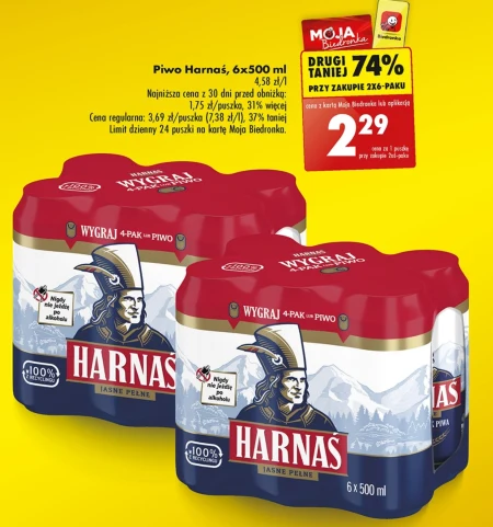 Piwo Harnaś, 6x500 ml 4,58 zł/l Najniższa cena z 30 dni przed obniżką: 1,75 zł/puszka, 31% więcej Cena regularna: 3,69 zł/puszka (7,38 zł/1), 37% taniej Limit dzienny 24 puszki na kartę Moja Biedronka.