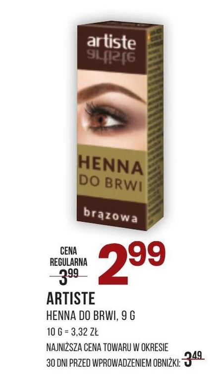 ARTISTE HENNA DO BRWI, 9 G 10 G = 3,32 ZŁ NAJNIŻSZA CENA TOWARU W OKRESIE 30 DNI PRZED WPROWADZENIEM OBNIŻKI: 3.49