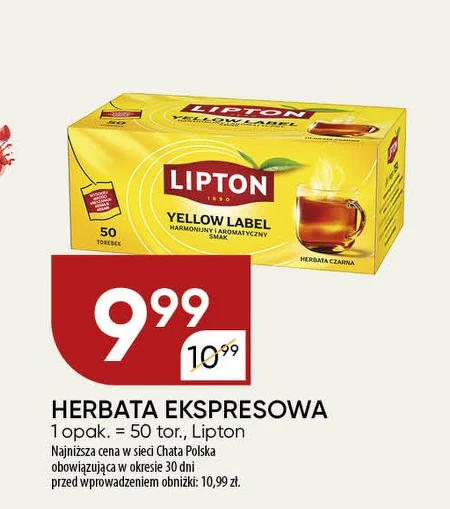 HERBATA EKSPRESOWA 1 opak. = 50 tor., Lipton Najniższa cena w sieci Chata Polska obowiązująca w okresie 30 dni przed wprowadzeniem obniżki: 10,99 zł.