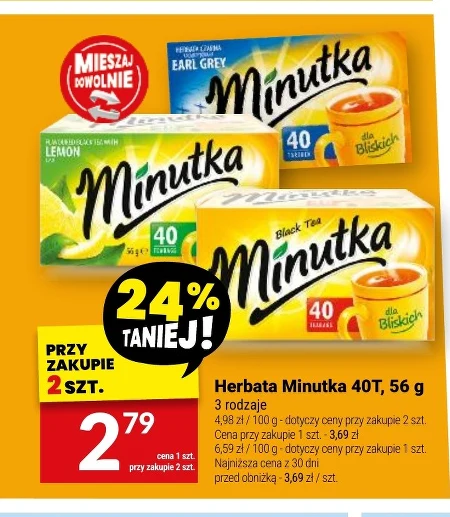 Herbata Minutka 40T, 56 g dostępna jest w Twoj Market w cenie 2,79 zł za sztukę przy zakupie dwóch opakowań, co stanowi 24% zniżki. W ofercie znajdziesz trzy rodzaje: czarną, Earl Grey oraz napój pomarańczowy z cytryną, każdy zawierający 40 torebek herbaty. Ten klasyczny napar doskonale sprawdzi się w chwilach relaksu, podczas spotkań z bliskimi lub jako codzienny rytuał. Obecnie możesz kupić tę herbatę w najniższej cenie w ciągu ostatnich 30 dni. Oferta ważna od 2026-04-15 do 2026-04-19 Źródło: gazetka Twoj Market