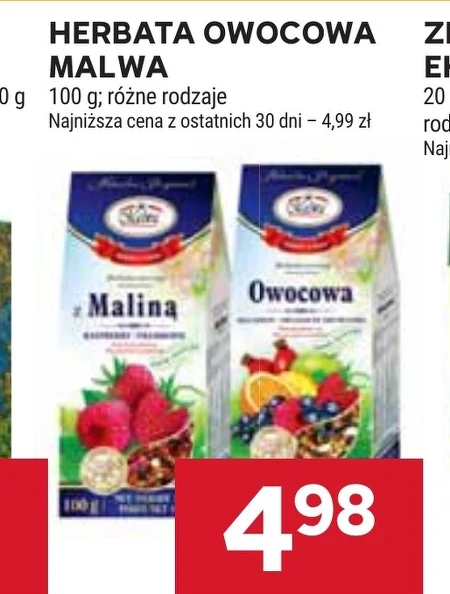 Herbata owocowa Malwa dostępna jest w ofercie Stokrotka w cenie 4,98 zł za opakowanie 100 g. To doskonały sposób na rozgrzewający i aromatyczny napój, idealny na chłodniejsze dni lub jako smaczna alternatywa dla herbaty czarnej czy zielonej. Różne rodzaje herbat owocowych Malwa zaspokoją gusta nawet najbardziej wymagających miłośników takich napojów. Najniższa cena w ciągu ostatnich trzydziestu dni wynosiła 4,99 zł, więc teraz jest to wyjątkowa okazja, aby zaopatrzyć się w ulubiony smak.
