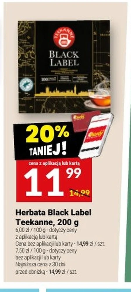 Herbata Black Label Teekanne, 200 g 6,00 zł / 100 g - dotyczy ceny z aplikacją lub kartą Cena bez aplikacji lub karty - 14,99 zł / szt. 7,50 zł / 100 g - dotyczy ceny bez aplikacji lub karty Najniższa cena z 30 dni przed obniżką - 14,99 zł / szt.
