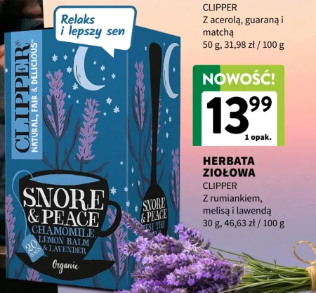 Herbata ziołowa Clipper z rumiankiem, melisą i lawendą jest dostępna w ofercie Intermarché w cenie 13,99 zł za opakowanie o gramaturze 30 g, co daje 46,63 zł za 100 g. Ta nowość to kompozycja delikatnych ziół, idealna do relaksu i wsparcia spokojnego snu. Napar ten doskonale sprawdzi się jako wyciszający rytuał wieczorny lub moment odprężenia w ciągu dnia. Warto skorzystać z tej okazji, by spróbować wyjątkowego smaku i właściwości tej ziołowej herbaty. Oferta ważna od 2026-04-08 do 2026-04-30 Źródło: gazetka Intermarche