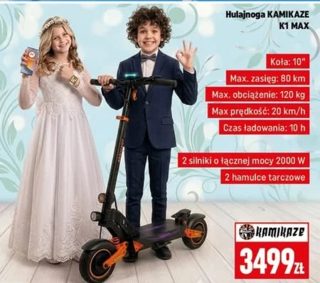 Hulajnoga KAMIKAZE K1 MAX Koła: 10" Max. zasięg: 80 km Max. obciążenie: 120 kg Max prędkość: 20 km/h Czas ładowania: 10 h 2 silniki o łącznej mocy 2000 W 2 hamulce tarczowe