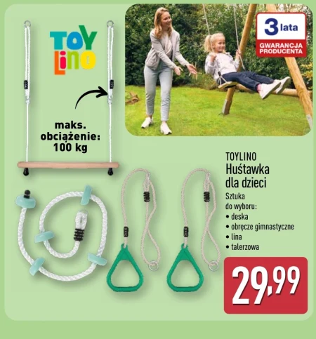 TOYLINO Huśtawka dla dzieci Sztuka do wyboru: · deska · obręcze gimnastyczne · lina · talerzowa Bezpieczna zabawa na świeżym powietrzu staje się jeszcze przyjemniejsza dzięki huśtawce Toylino, dostępnej w czterech wariantach: deski, obręczy gimnastycznych, liny oraz wersji talerzowej. Klasyczna huśtawka ogrodowa dla dzieci to doskonały sposób na aktywne spędzanie czasu, rozwijanie zmysłu równowagi i koordynacji ruchowej u najmłodszych.