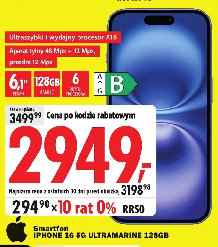 Smartfon IPHONE 16 5G ULTRAMARINE 128GB Ultraszybki i wydajny procesor A18 Aparat tylny 48 Mpx + 12 Mpx, przedni 12 Mpx