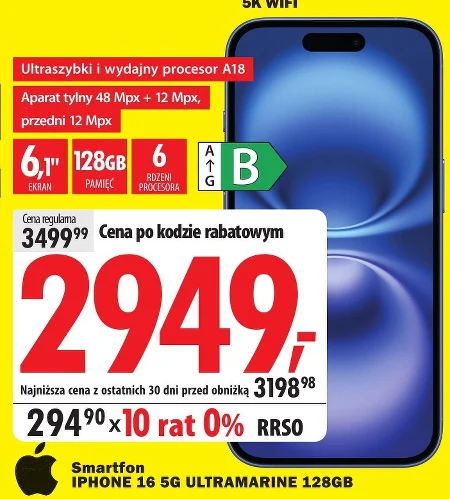 Smartfon IPHONE 16 5G ULTRAMARINE 128GB Ultraszybki i wydajny procesor A18 Aparat tylny 48 Mpx + 12 Mpx, przedni 12 Mpx