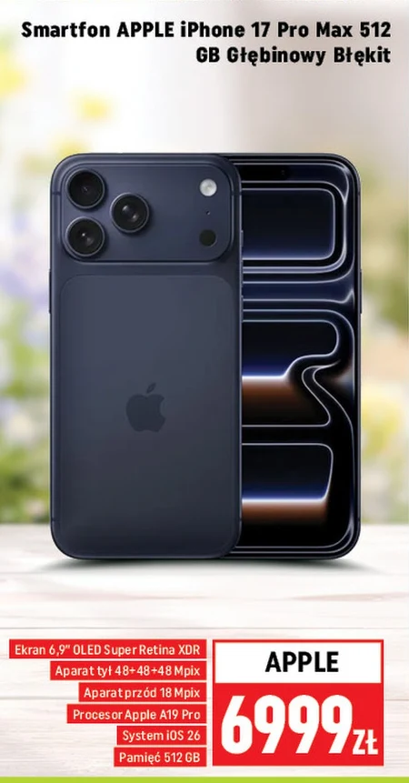 Smartfon APPLE iPhone 17 Pro Max 512 GB w kolorze Głębbinowy Błękit jest dostępny w ofercie Neopunkt w cenie 6999 zł. Wyposażony jest w rozbudowany system aparatów, zarówno z tyłu, jak i z przodu, co pozwala na robienie zdjęć o wysokiej rozdzielczości i nagrywanie filmów. Dzięki zaawansowanemu procesorowi i systemowi iOS, zapewnia płynne działanie i dostęp do najnowszych funkcji. Telefon posiada duży wyświetlacz OLED Super Retina XDR, idealny do oglądania filmów i grania w gry. Oferuje sporą pamięć wewnętrzną, która pomieści wszystkie zdjęcia, filmy i aplikacje. To nowoczesne urządzenie przeznaczone dla osób ceniących sobie wysoką jakość i innowacyjne rozwiązania. Ten model stanowi doskonałą okazję dla tych, którzy poszukują wydajnego i funkcjonalnego smartfona. Zaawansowane technologie, elegancki design i niezawodność czynią go wyjątkowym wyborem. Oferta ważna od 2026-03-30 do 2026-04-19 Źródło: gazetka Neopunkt