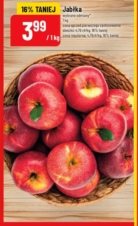 Jabłka wybrane odmiany* 1 kg cena sprzed pierwszego zastosowania obniżki: 4,79 zł/kg, 16% taniej cena regularna: 4,79zł/kg, 16% taniej Soczyste i słodkie jabłka to doskonały wybór na zdrową przekąskę, idealne do bezpośredniego spożycia lub przygotowania pysznych deserów, soków i kompotów, wspierając zdrową dietę bogatą w witaminy i błonnik. Świetnie sprawdzą się również jako dodatek do wypieków, takich jak szarlotka czy ciasta drożdżowe, wzbogacając ich smak i aromat, stanowiąc naturalne źródło energii. Wybierając jabłka, dbasz o swoje zdrowie i wspierasz lokalnych producentów, ciesząc się smakiem świeżych owoców przez cały rok.