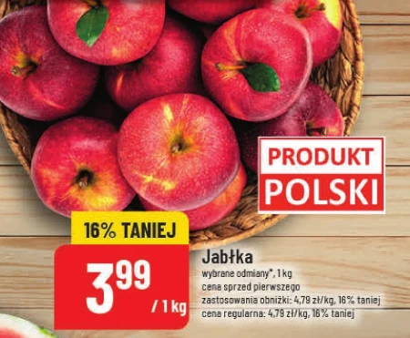 Jabłka wybrane odmiany*, 1kg cena sprzed pierwszego zastosowania obniżki: 4,79 zł/kg, 16% taniej cena regularna: 4,79 zł/kg, 16% taniej Świeże i soczyste jabłka to doskonały wybór na zdrową przekąskę, idealne do przygotowania kompotów, ciast czy aromatycznych soków – bogactwo witamin sprawia, że są niezastąpione w codziennej diecie. Wykorzystaj je do przygotowania pysznych deserów, dodaj do owsianki lub po prostu ciesz się ich naturalnym smakiem jako element zdrowego odżywiania i wsparcia odporności. Owoce te są cennym źródłem błonnika, wspomagającym trawienie i przyczyniającym się do lepszego samopoczucia, stanowiąc podstawę zdrowej kuchni.