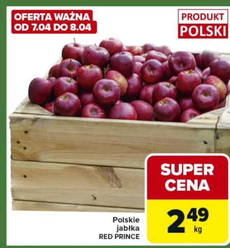 Polskie jabłka RED PRINCE dostępne są w ofercie Carrefour Express w cenie 2,49 zł za kilogram. To doskonały wybór dla osób ceniących świeże i soczyste owoce prosto od polskich sadów. Jabłka RED PRINCE świetnie nadają się do bezpośredniego spożycia, idealnie ugasią pragnienie jako zdrowa przekąska, a także doskonale sprawdzą się w przetworach, szarlotkach czy kompotach. Warto skorzystać z tej okazji i zaopatrzyć się w te smaczne jabłka w atrakcyjnej cenie. Oferta ważna od 2026-04-07 do 2026-04-08 Źródło: gazetka Carrefour Express