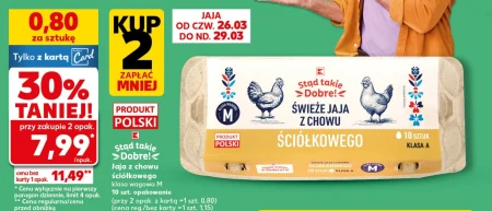 Jaja z chowu ściółkowego klasy M, 10 sztuk w opakowaniu, dostępne są w ofercie Kaufland w cenie 0,80 zł za sztukę przy zakupie z kartą Card. To podstawowy produkt spożywczy, idealny do wielu potraw – od prostych śniadań, przez wypieki, po dania obiadowe. Skorzystaj z promocji i kupując dwa opakowania, zapłacisz mniej, a produkt jest polski i oznaczony jako „Dobre!”. Promocja obowiązuje od czwartku, 26 marca do niedzieli, 29 marca.