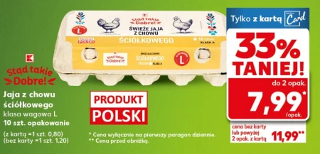 Jaja z chowu ściółkowego klasy L, 10 sztuk w opakowaniu, dostępne są w ofercie Kaufland w cenie 7,99 zł za opakowanie z kartą lojalnościową, co oznacza 33% taniej. Bez karty cena za opakowanie wynosi 11,99 zł, jednak promocja obowiązuje tylko na pierwsze opakowanie zakupione dziennie oraz do dwóch opakowań. Jaja są produktem polskim, idealnym do przygotowania wielu potraw, od prostych śniadań po wykwintne desery. Warto skorzystać z tej okazji, ponieważ cena jest atrakcyjna i pozwala zaoszczędzić na podstawowych produktach spożywczych. Oferta ważna od 2026-04-13 do 2026-04-15 Źródło: gazetka Kaufland