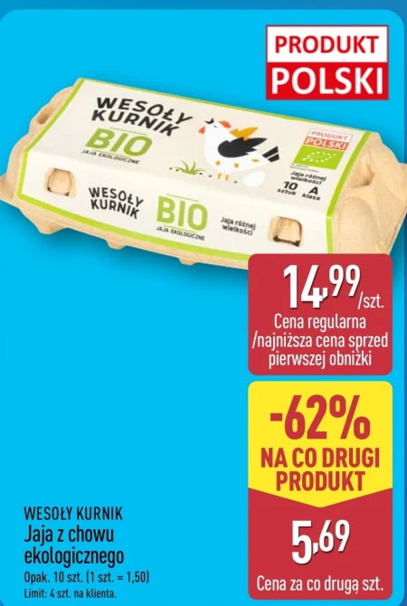 WESOŁY KURNIK Jaja z chowu ekologicznego Opak. 10 szt. (1 szt. = 1,50) Limit: 4 szt. na klienta. Jaja Wesoły Kurnik z chowu ekologicznego teraz w wyjątkowej ofercie w Aldi – zapłacisz tylko 5,69 zł za drugie opakowanie! Wybierając te jaja, wspierasz bardziej odpowiedzialną produkcję i masz pewność świeżości. Przy zakupie dwóch opakowań 10 sztuk, cena za sztukę wynosi zaledwie 1,50 zł, co czyni tę propozycję niezwykle atrakcyjną. Pamiętaj o limicie 4 opakowań na klienta.
