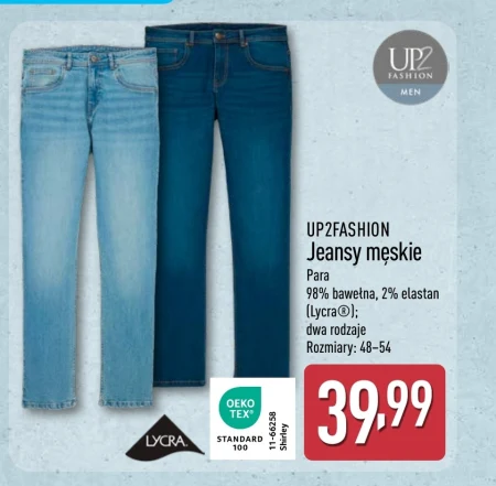 Jeansy męskie UP2FASHION dostępne są w ofercie Aldi w cenie 39,99 za parę. Wykonane z wysokiej jakości bawełny z dodatkiem elastanu (Lycra®), zapewniają komfort noszenia i swobodę ruchów. Dostępne są dwa warianty, a rozmiary wahają się od 48 do 54, co pozwala na dopasowanie do różnych sylwetek. Spodnie te to praktyczny wybór na co dzień, idealne do wielu stylizacji. Warto skorzystać z tej oferty, aby uzupełnić swoją garderobę solidnymi i wygodnymi jeansami. Oferta ważna od 2026-04-13 do 2026-04-18 Źródło: gazetka Aldi